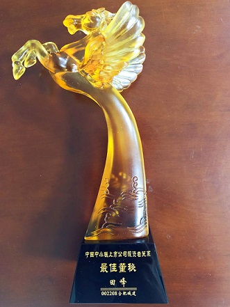 公司董事会秘书田峰同志被评选为中国中小板上市公司投资者关系最佳董秘。在目前A 958家中小板上市公司中,仅有50家上市公司董秘获此殊荣。