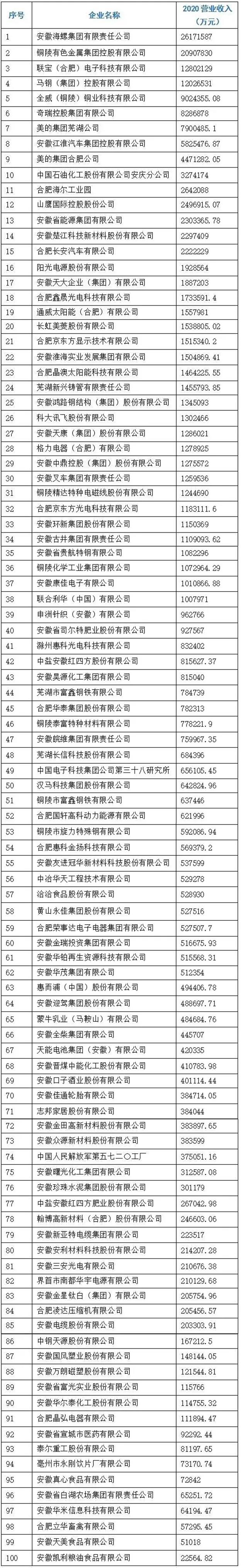 2021安徽省制造业百强企业榜单